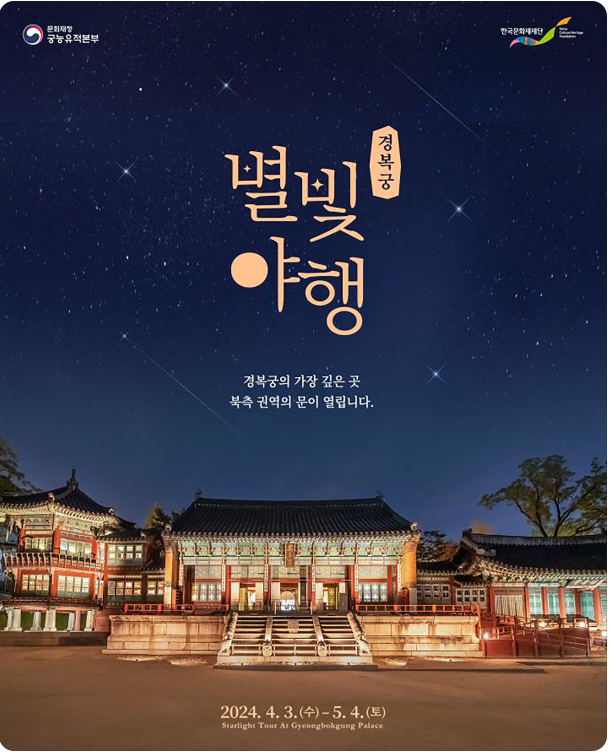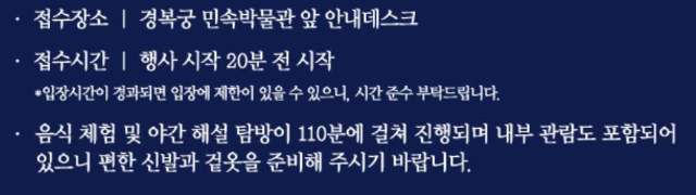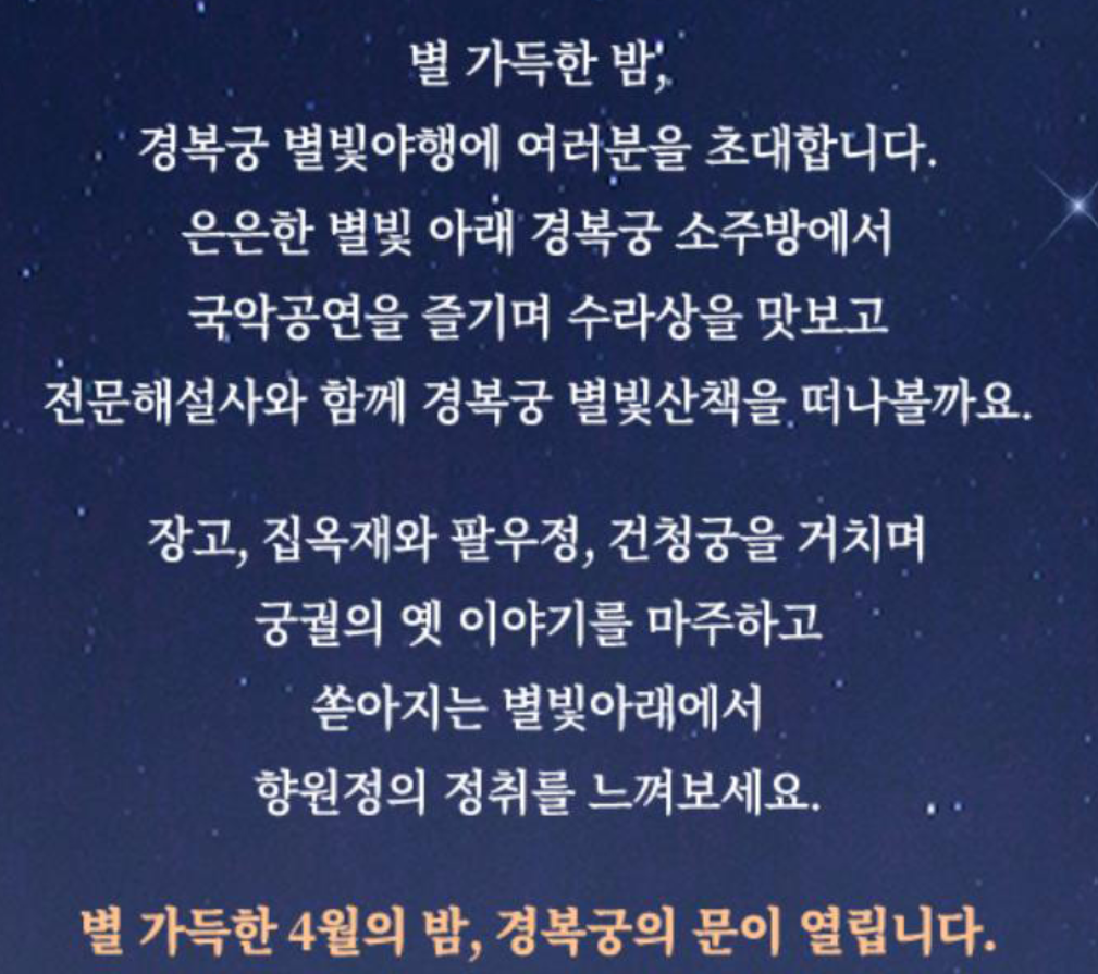 행사내용 : 경복궁 소주방 궁중음식체험과 경복궁 북측권역 전각에 대한 해설을 들으며, 경복궁의 역사·문화·조경 등을 체험할 수 있는 야간 기행