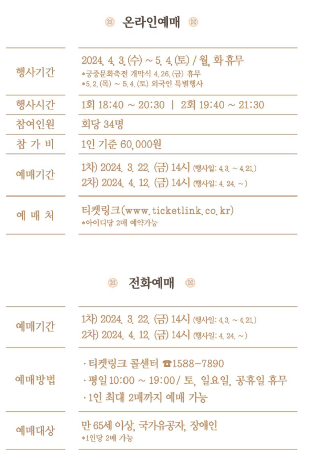 행사기간 : 2024. 4. 3.(수) ~ 5. 4.(일) 매주 수~일요일(월, 화 휴무/ 4.26. 궁중문화축전 개막식 휴무)