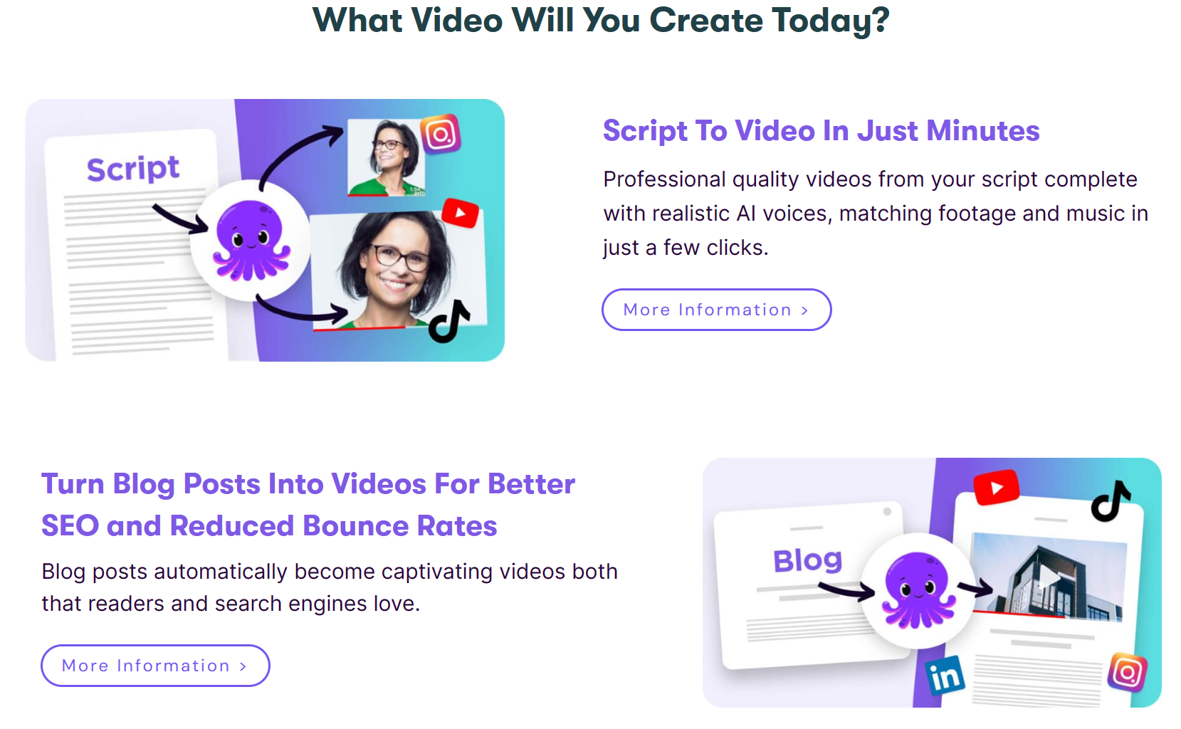 음성 인식 기능을 통한 자막 자동 생성, 직접 녹음하지 않아도 되는 500여 개의 AI 목소리, 상업적으로 사용가능한 무료 이미지, 비디오, 배경음악 AI가 대본과 영상을 한 번에, 텍스트로 비디오 만들기 등의 기능 지원