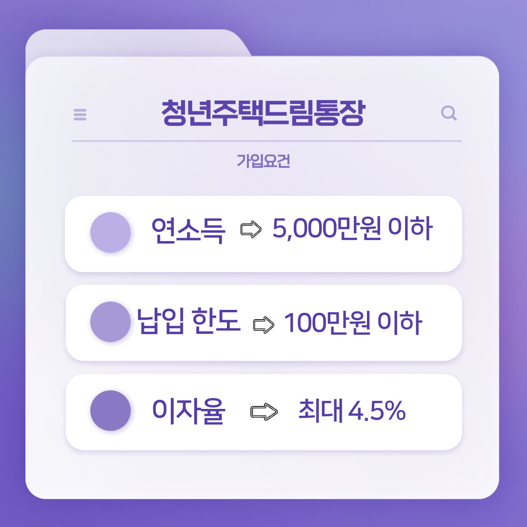 여기서 말하는 청년은 만 19~34세를 말하며 무주택자라면 연소득 5000만원 이하를 충족하면 가입할 수 있으며 여기에 더해 연 4.5%의 금리로 월 최대 100만원까지 납입할 수 있습니다.